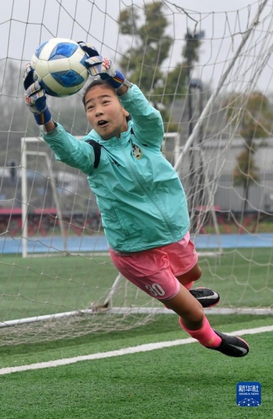 在瀘州天立春雨學(xué)校足球場(chǎng),來(lái)自涼山彝族自治州的拉普么拉扎在進(jìn)行守門(mén)員訓(xùn)練(3月29日攝)。