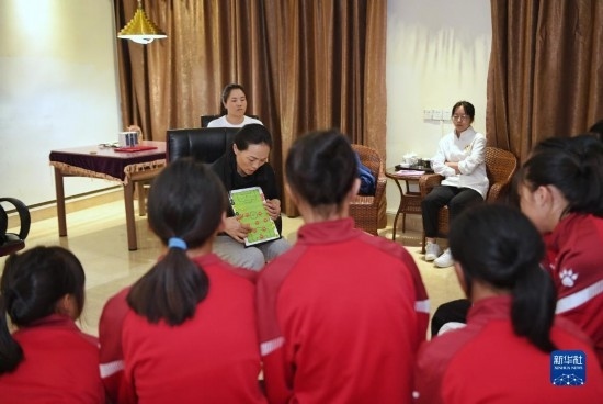 在海南瓊中縣舉辦的中國(guó)足協(xié)女足青訓(xùn)中心“希望杯”U12組比賽的空閑時(shí)段,來(lái)自涼山彝族自治州的四川隊(duì)隊(duì)員舍布么扯鳩莫(左二)和隊(duì)友們?cè)诶蠋煄ьI(lǐng)下學(xué)習(xí)文化課(4月10日攝)。