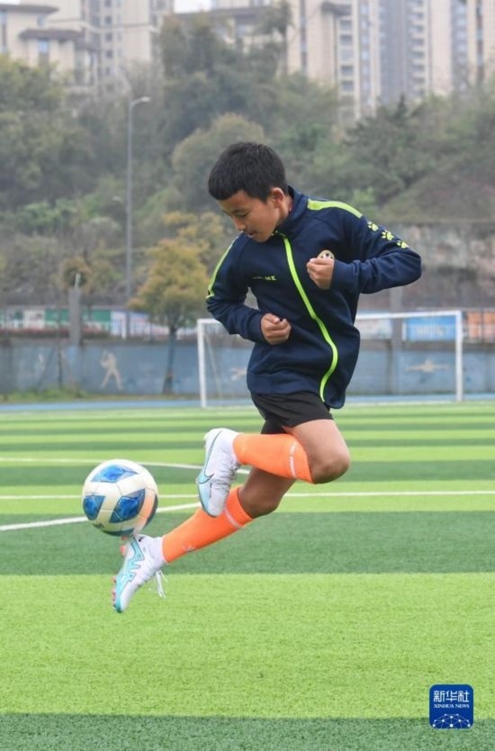 在瀘州天立春雨學(xué)校足球場(chǎng),來(lái)自涼山彝族自治州的楊坤在進(jìn)行訓(xùn)練(3月29日攝)。