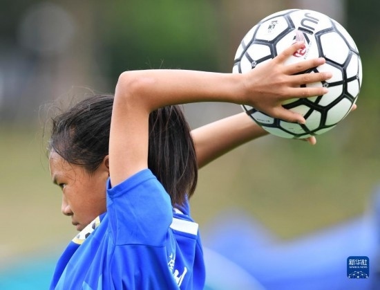 在海南瓊中縣舉辦的中國(guó)足協(xié)女足青訓(xùn)中心“希望杯”U12組四川隊(duì)對(duì)陣廣東隊(duì)的比賽中,來(lái)自涼山彝族自治州的四川隊(duì)球員舍布么扯鳩莫發(fā)邊線球(4月10日攝)。