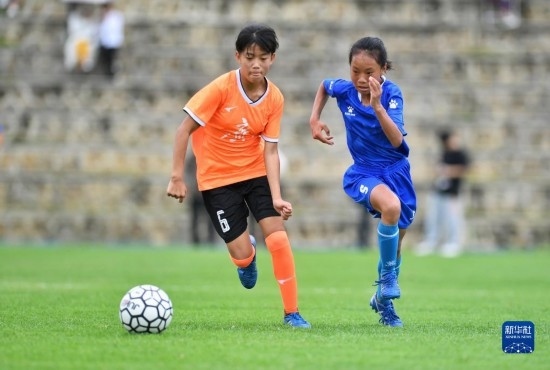 在海南瓊中縣舉辦的中國(guó)足協(xié)女足青訓(xùn)中心“希望杯”U12組四川隊(duì)對(duì)陣廣東隊(duì)的比賽中,來(lái)自涼山彝族自治州的四川隊(duì)球員舍布么扯鳩莫(右)奮力拼搶(4月10日攝)。