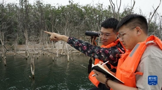 北京市水務(wù)局密云水庫(kù)管理處水生態(tài)管護(hù)員在觀察和記錄候鳥育雛情況(5月31日攝)。