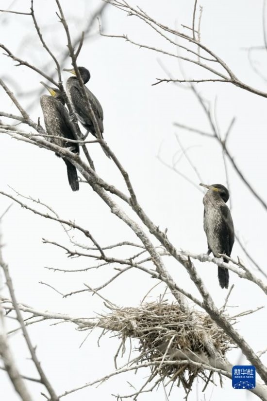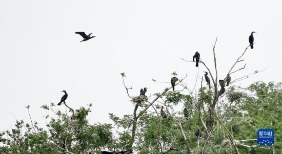 準(zhǔn)備學(xué)習(xí)飛翔的幾只鸕鶿幼鳥棲息在密云水庫(kù)“鳥島”的樹上(5月31日攝)。