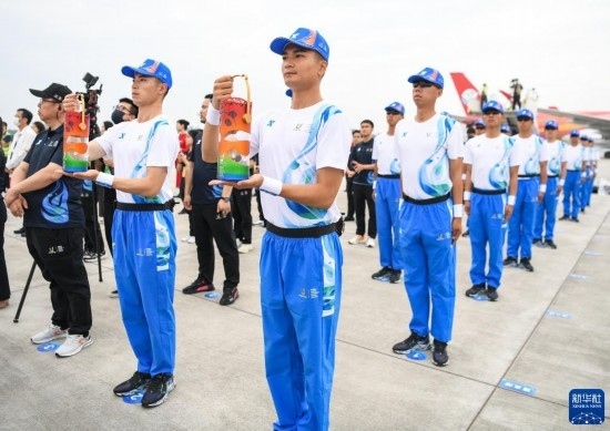 6月8日,在成都天府國(guó)際機(jī)場(chǎng),護(hù)衛(wèi)隊(duì)隊(duì)員手持成都大運(yùn)會(huì)火種燈。新華社記者 王曦 攝