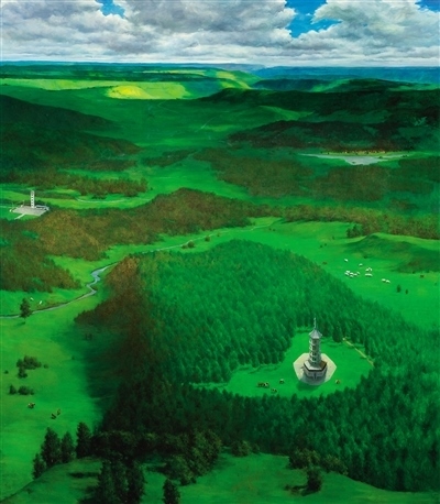 河北塞罕壩林場(chǎng),是“三北”工程建設(shè)的重要區(qū)域。荒原變林海的塞罕壩奇跡,成為近年來主題性美術(shù)創(chuàng)作的重要課題。入選“筑夢(mèng)——我們的新時(shí)代美術(shù)攝影作品展”的譚智群油畫《美麗的塞罕壩》,是在實(shí)地寫生基礎(chǔ)上的藝術(shù)提煉和情感升華。作者以俯視的構(gòu)圖,鋪展?jié)M目蒼翠的美景。畫面左側(cè),清澈的河流蜿蜒向前;畫面右側(cè),白色的雁群逐綠翱翔;遠(yuǎn)方,茂密的森林不斷延伸,風(fēng)力發(fā)電機(jī)林立于山巔,畫面充滿生機(jī)與活力。同樣以俯視的角度處理構(gòu)圖,孔亮油畫《美麗中國(guó)——塞罕壩》則以塞罕壩林場(chǎng)和塞罕塔為視覺中心,蔥蘢的綠意,將意境渲染得更加深邃。翁凱旋油畫《滄海桑田——塞罕壩的前世今生》,通過三聯(lián)畫的形式,在新舊對(duì)比中構(gòu)建時(shí)空長(zhǎng)廊,描繪出塞罕壩的時(shí)代變遷。
