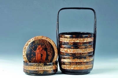 工藝技法與地方名品是漆器展示的兩個(gè)脈絡(luò),其中既有日用品,亦有陳設(shè)品。福建福州脫胎漆器如“鳳凰牡丹紋瓶”不僅輕巧靈動,且圖案精美,色彩豐富。北京漆器以雕漆見長,造型古樸,裝飾典雅。江蘇揚(yáng)州漆器兼具螺鈿與雕漆工藝,裝飾頗有文人趣味。福建永春郭振盛所造“金漆彩繪提盒”富有裝飾性,多用于迎神祭祖、民間嫁娶和走親訪友。四川成都“推光漆果盒”以黑地博古圖案表達(dá)“壽考神仙”之題,盒內(nèi)分兩圈九格,分髤沉穩(wěn)五色,既實(shí)用又美觀。四川涼山彝族漆器則以木為胎,質(zhì)樸粗獷,多髹紅、黃、黑三色,分別象征著勇敢、光明與莊重。在漆器單元的“彝族漆器圖案內(nèi)涵”小專題中,觀眾從自然、動植物、生產(chǎn)生活等多個(gè)類別的圖案中得以了解彝族人民對自然的崇拜與敬畏。