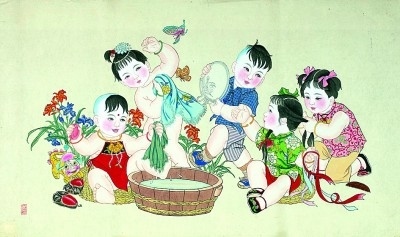 將秦瓊、尉遲恭的門神形象立于展廳中一扇大門的兩側(cè),頓時(shí)營造出威嚴(yán)的氛圍。參展的年畫多刻印精細(xì),描繪精致,題材分為驅(qū)邪納福、戲曲傳說、世俗生活和新年畫等。天津楊柳青年畫既有名家錢慧安、高桐軒舊版新印的名作,亦有青年畫家創(chuàng)作的新題材,如那啟明表現(xiàn)豐收題材的《金粟碧波》,邵文錦贊頌解放婦女、促進(jìn)生產(chǎn)的《山鵲別處啼》,張鸞基于傳統(tǒng)年畫《五子奪蓮》創(chuàng)作的愛國衛(wèi)生題材年畫《五子愛清潔》等。濰坊楊家埠以“舊瓶裝新酒”創(chuàng)作新年畫,如《農(nóng)忙托兒所》上題有“爹媽安心去生產(chǎn),加緊建設(shè)新中國”。