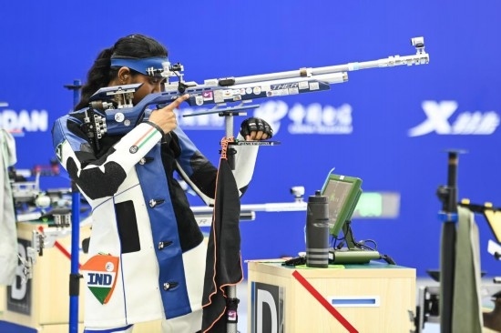 2023年7月29日,印度隊選手瓦拉里萬以252.5環(huán)的總成績獲得第31屆世界大學生夏季運動會女子10米氣步槍冠軍。新華社記者 曹祎銘 攝