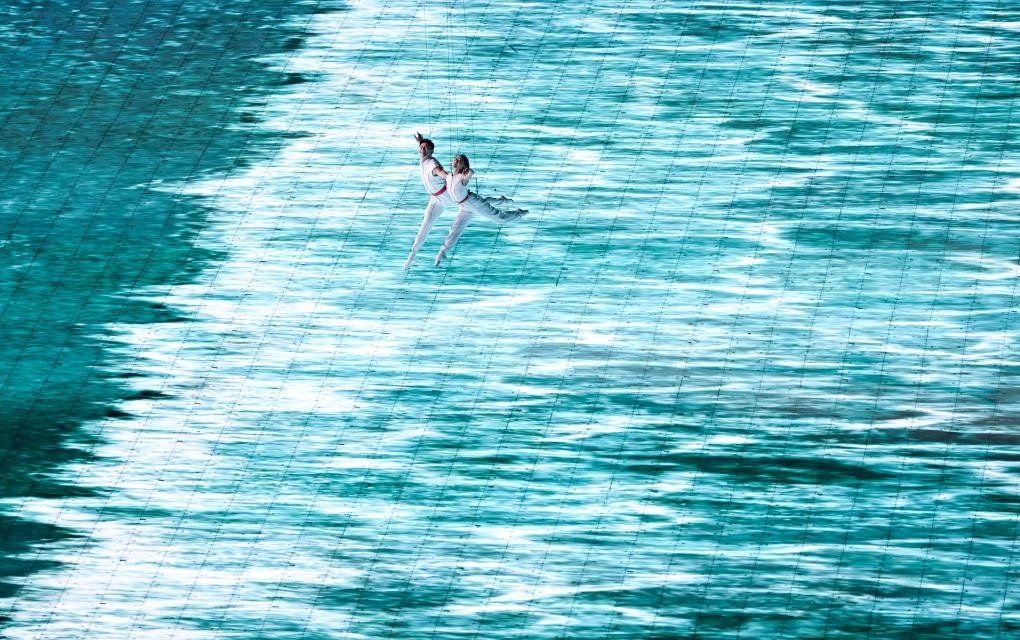 本屆亞運(yùn)會首次將3D雙威亞技術(shù)應(yīng)用于大型運(yùn)動(dòng)場中。立體飛旋于空中的男女演員與潮共舞,吊著威亞的他們在空中完成了各種高難度動(dòng)作,并與地屏中的浪潮實(shí)時(shí)互動(dòng),踏浪而行,成就了科技與藝術(shù)完美融合。