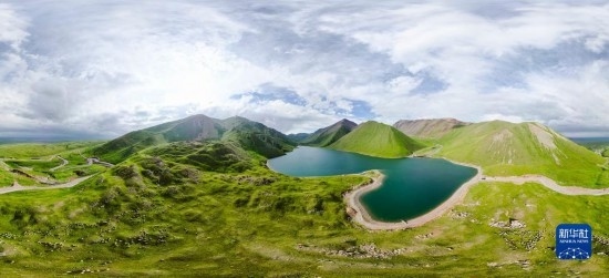 這是和靜縣一處高山湖泊景觀(7月5日攝,無人機全景照片)。