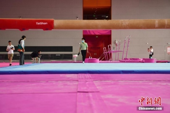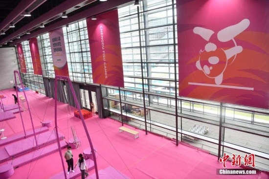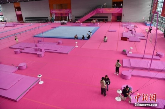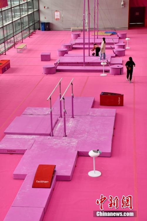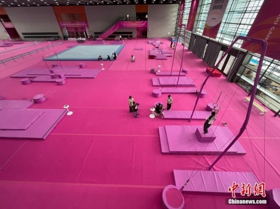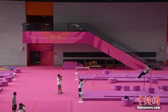 7月14日,成都東安湖體育公園內(nèi),成都大運(yùn)會(huì)體操比賽訓(xùn)練場(chǎng)的粉色布置吸引媒體記者探訪。海綿墊、平衡木、吊環(huán)、鞍馬等設(shè)施均為粉色,充滿(mǎn)青春活力,令人倍感放松。目之所及,海綿墊、平衡木、吊環(huán)、鞍馬等設(shè)施均為粉色。