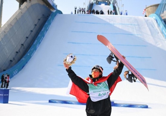 2022年2月15日,中國(guó)選手蘇翊鳴在頒發(fā)紀(jì)念品儀式后。當(dāng)日,北京2022年冬奧會(huì)單板滑雪男子大跳臺(tái)決賽在北京首鋼滑雪大跳臺(tái)舉行。中國(guó)選手蘇翊鳴奪得金牌。新華社記者黃宗治攝