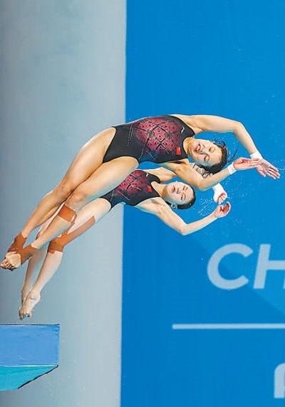 7月31日,中國代表團(tuán)選手張家齊(后)、掌敏潔在女子雙人10米跳臺(tái)決賽中。本報(bào)記者 伊 霄攝