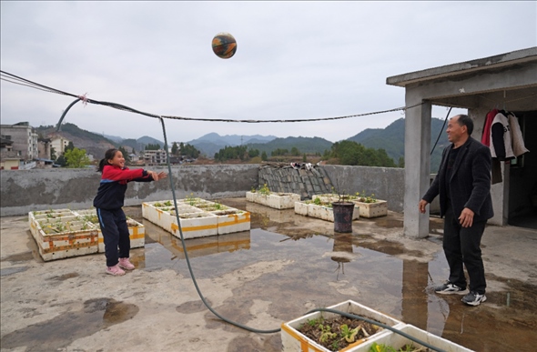 3月27日,李文文在屋頂露臺(tái)和父親玩投籃游戲。李文文是貴州臺(tái)江縣臺(tái)盤(pán)鄉(xiāng)中心小學(xué)的女籃隊(duì)長(zhǎng),以前他的父親在外地務(wù)工,如今火爆全網(wǎng)的“美麗鄉(xiāng)村”籃球聯(lián)賽給臺(tái)盤(pán)鄉(xiāng)帶來(lái)了人氣,父親在家門口就能找到工作。