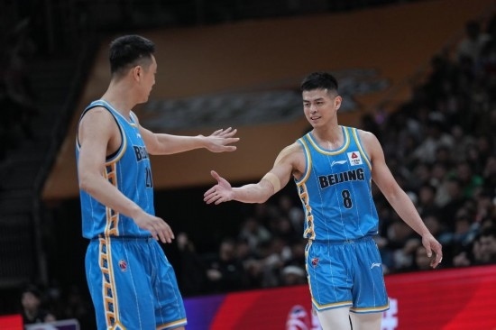 4月18日,CBA季后賽,北京首鋼隊球員方碩(右)與隊友翟曉川擊掌。新華社記者潘昱龍攝