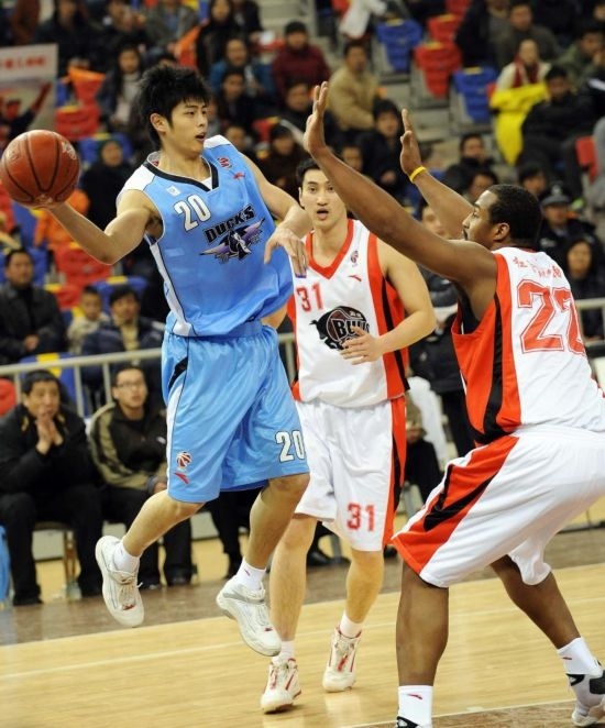 2009年1月21日,代表北京金隅隊的方碩(左)在CBA聯(lián)賽中分球。新華社記者藺以光攝