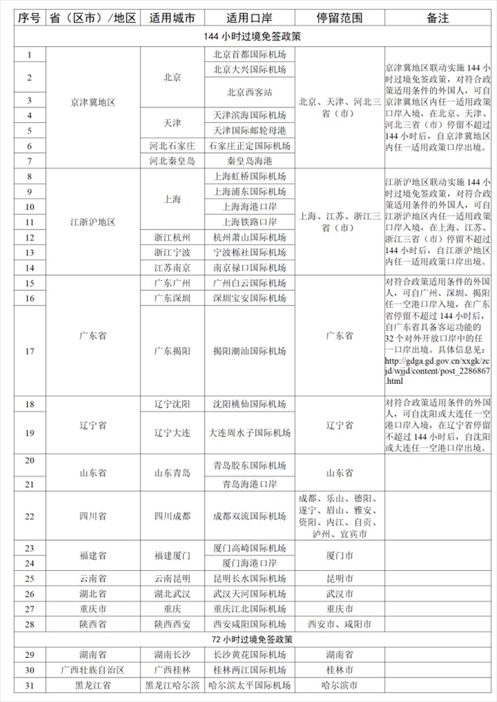 如外國人符合上述條件,可向我國20個(gè)城市的邊檢機(jī)關(guān)提出辦理144小時(shí)過境免簽申請(qǐng),或向3個(gè)城市的邊檢機(jī)關(guān)提出辦理72小時(shí)過境免簽申請(qǐng),其他城市暫未實(shí)施該項(xiàng)政策。