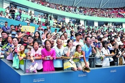 9月29日,杭州亞運(yùn)會(huì)網(wǎng)球女子單打決賽現(xiàn)場(chǎng),觀眾在歡呼。本報(bào)記者陳城攝 光明圖片