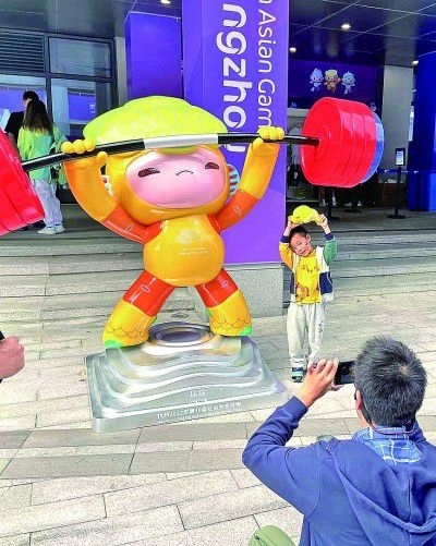 10月5日,亞運(yùn)會(huì)舉重場(chǎng)館外,觀眾爭(zhēng)相與吉祥物合影,一位小朋友特意擺出與吉祥物“琮琮”一樣的舉重姿勢(shì)合影留念。本報(bào)記者 楊震攝/光明圖片