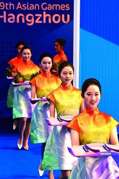9月30日,亞運(yùn)會(huì)跳水項(xiàng)目頒獎(jiǎng)儀式上,禮儀人員手托裝有獎(jiǎng)牌的托盤,面帶笑容走向頒獎(jiǎng)臺(tái)。本報(bào)記者 楊震攝/光明圖片