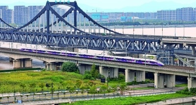 10月3日,亞運(yùn)涂裝復(fù)興號(hào)智能動(dòng)車組從杭州東站發(fā)出,穿過(guò)錢塘江。本報(bào)記者 陳城攝/光明圖片