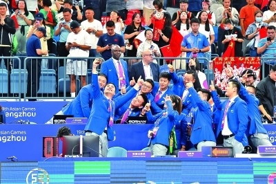 10月5日,女籃決賽后,技術(shù)官員在自拍合影。 本報(bào)記者 陳茵攝/光明圖片