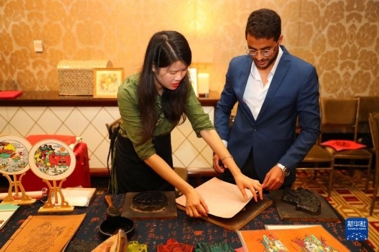 11月19日,在埃及開羅舉行的粵港澳大灣區(qū)世界級旅游目的地推介暨“魅力廣東”視覺展上,一名男子在非遺展區(qū)體驗木板年畫制作。