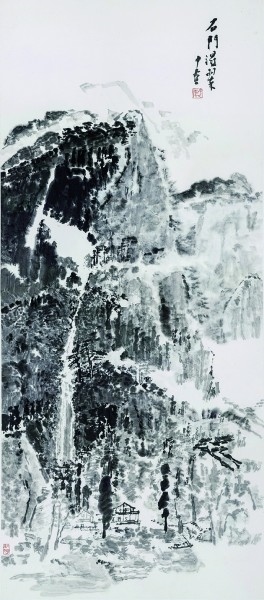 傳統(tǒng)中國畫講究筆墨技法,童中燾對此深研體悟。談到筆墨,普通觀眾往往覺得“玄虛莫辨”,一幅畫的筆墨高下、好壞如何判別?童中燾說:“古人云‘山水不出筆墨情景’,情景者境界,境能奪人,而筆能奪境?!秉S賓虹總結(jié)“筆法五種”“墨法七種”,“五筆”指的是平、圓、留、重、變,“七墨”指的是濃墨、淡墨、破墨、潑墨、積(漬)墨、焦墨、宿墨。童中燾吸收前人經(jīng)驗(yàn),總結(jié)歸為“五墨”:清、潤、沉、和、活。他進(jìn)而指出,用筆用墨,凡達(dá)到“五筆”“五墨”的,就叫用筆好、用墨好。比如“清”,指的是“用筆用墨,筆路清澈,層層相積,無混濁相”。細(xì)觀童中燾筆下的山石樹木,雖筆墨點(diǎn)畫繁復(fù),但近看筆筆清晰,沉穩(wěn)勁道,收放自如,如同“以拔山舉鼎之力,為舞女插花”,比較于不善畫者的“弱、軟、飄、板、涂、抹”等弊病,其精妙之處立顯。