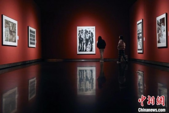 觀眾在江蘇省美術(shù)館展廳內(nèi)欣賞展出的版畫作品。 中新網(wǎng)記者 泱波 攝