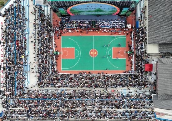這是10月25日拍攝的全國和美鄉(xiāng)村籃球大賽(村BA)總決賽現(xiàn)場(chǎng)(無人機(jī)照片)。新華社記者 歐東衢 攝