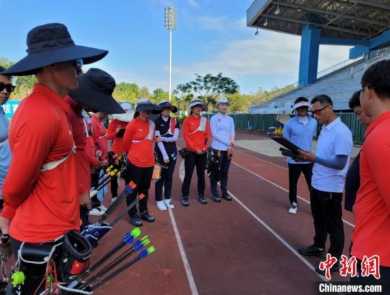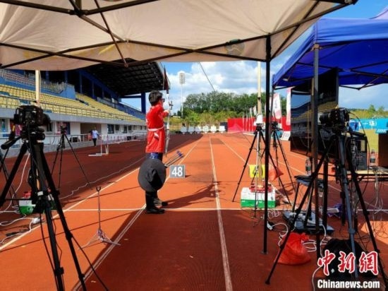 國家體育訓(xùn)練南方基地(海南白沙·綜合),國家射箭隊紅隊在進行一場隊內(nèi)賽。 中新網(wǎng)記者 王曉斌 攝