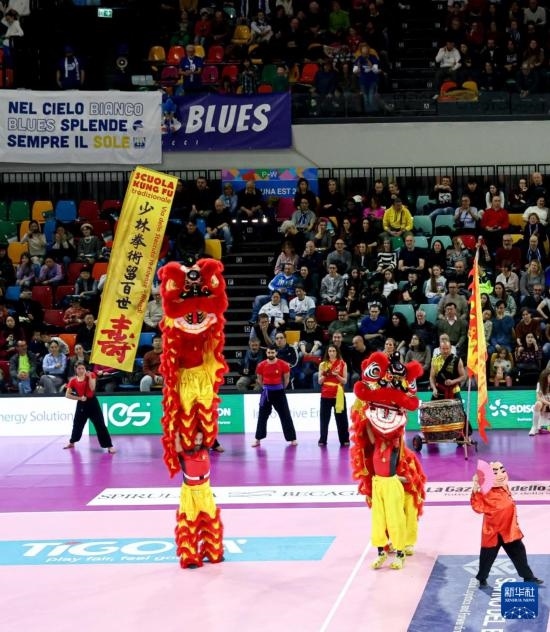 這是2月4日在意大利斯坎迪奇排球俱樂部主場體育館拍攝的比賽局間休息時(shí)間的舞獅表演。新華社記者 李京 攝