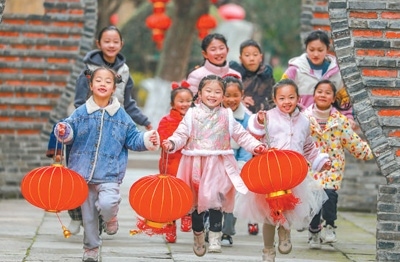 孩子們在荻港村中舉著燈籠,歡快奔跑。陸志鵬攝(人民視覺)