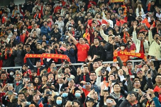 據(jù)主辦方介紹,天津奧體中心體育場的球票基本銷售一空,有42977名觀眾到場為中國隊助威。比賽在晚上8點開球,結(jié)束已是10點左右。初春夜晚加之冷風(fēng),寒意十足,但球迷的熱情和助威貫穿全程。