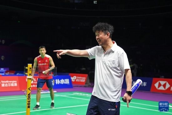 4月26日,中國(guó)羽毛球協(xié)會(huì)副主席夏煊澤(右)在訓(xùn)練中指導(dǎo)王祉怡。新華社記者 侯昭康 攝