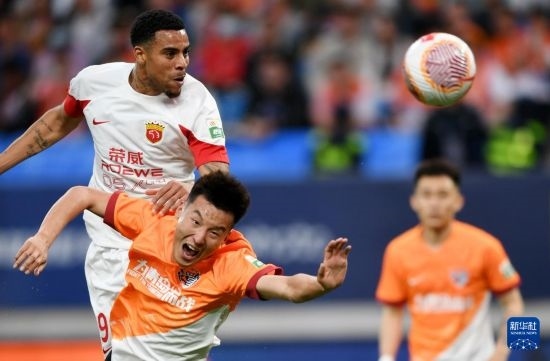 5月1日,上海海港隊(duì)球員古斯塔沃(左上)在比賽中與青島海牛隊(duì)球員劉佳燊拼搶。