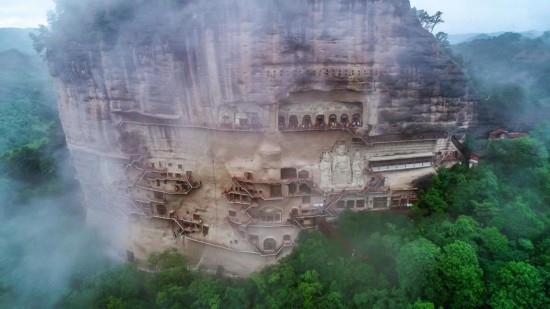 這是2023年5月31日在甘肅省天水市拍攝的煙雨籠罩下的麥積山石窟(無(wú)人機(jī)照片)。新華社記者 郎兵兵 攝