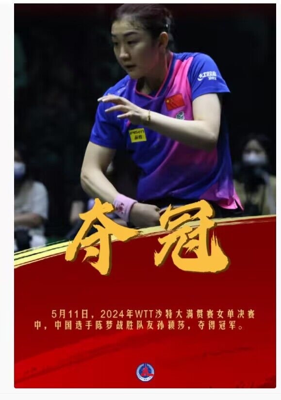 今天,在2024年WTT沙特大滿貫賽女單決賽中,中國選手陳夢(mèng)戰(zhàn)勝隊(duì)友孫穎莎 ,奪得冠軍。祝賀陳夢(mèng),孫穎莎辛苦了!拼過就是勝利,繼續(xù)加油?。ㄓ浾撸和鹾V蓿?/p>