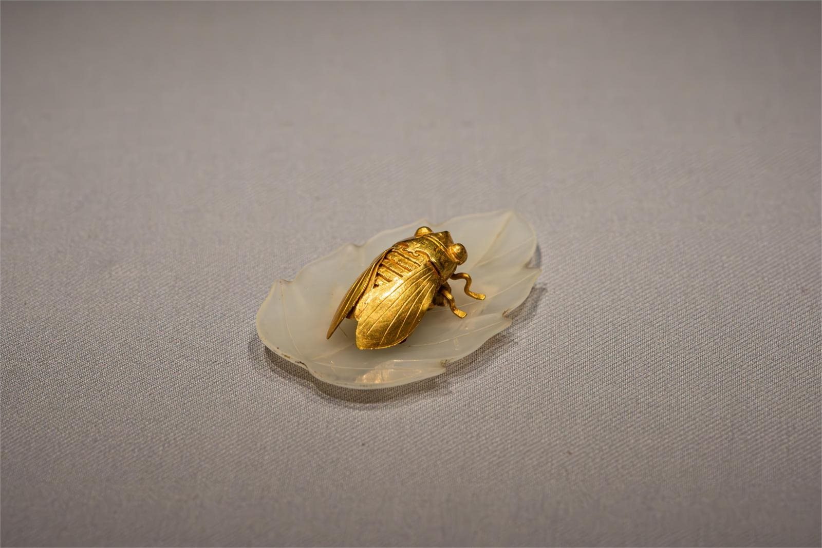 金蟬玉葉是南京博物院的鎮(zhèn)院之寶之一,是500年前貴族女子發(fā)髻上的一件時尚單品。在《玉潤中華——中國玉器的萬年史詩圖卷》大展上,它也是“網紅文物”之一。形神畢肖、金光閃耀的蟬棲憩在玉葉上,它嘴巴微張好似在奏鳴,玉葉葉脈分明,細薄呈凹弧狀,經鑒定金蟬含金量達到95%,而蟬翼厚度僅為0.2毫米,工藝精致且繁復。