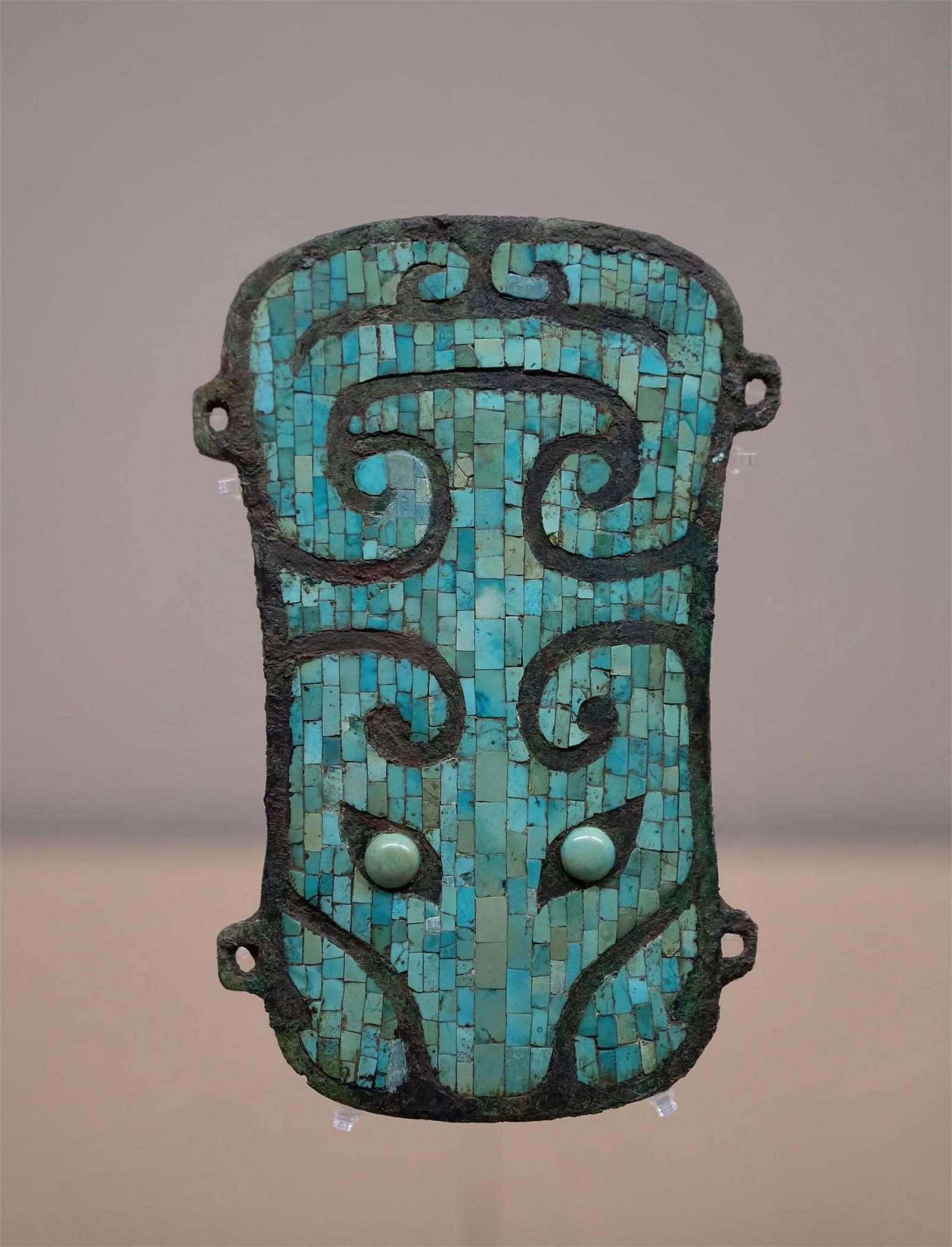 3500年前的鑲嵌綠松石獸面紋銅牌飾,是二里頭夏都遺址博物館的“頂流”。它器身用貴金屬青銅鑄出主體框架,略微拱起的弧形銅胎上,鑲嵌著數百片綠松石,神奇絢爛。它的發(fā)掘地二里頭遺址是中國古代文獻記載的第一個王朝夏朝的都城,牌飾上,綠幽幽的“眼睛”見證了“最早的中國”。