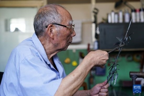 今年80歲的湯傳松,是蕪湖工藝美術(shù)廠的技術(shù)總監(jiān),也是蕪湖鐵畫鍛制技藝省級非物質(zhì)文化遺產(chǎn)傳承人。據(jù)湯傳松介紹,鐵畫鍛制工藝起源于鐵匠,需將鐵燒紅,而后使用錘頭趁熱打鐵,將鐵塑造成畫稿中的基本形狀,而后使用銼、鉆等工具進(jìn)一步塑造,乃至用剪刀、鑷子進(jìn)行修形,再將各個部位焊接組合,最后裝裱成畫,流程繁多,制作周期較長。