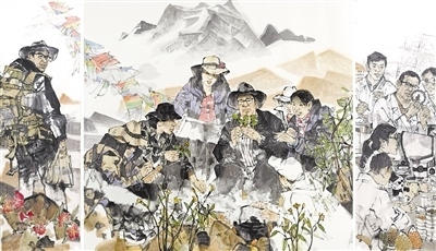 在講述共產(chǎn)黨員故事的美術(shù)佳作中,油畫作品占據(jù)相當(dāng)比例。這些作品既以油畫的較強(qiáng)表現(xiàn)力使人物形象生動飽滿,也體現(xiàn)了美術(shù)工作者對油畫民族化的持續(xù)探索。比如,在中國文學(xué)藝術(shù)界聯(lián)合會、中國美術(shù)家協(xié)會、中國國家博物館共同主辦的“最美中國人”美術(shù)作品展上,孫立新《高原“守護(hù)神”——郭毅力》以寫實的人物形象、亮麗的色彩,頌揚(yáng)主人公扎根雪域高原38年的奉獻(xiàn)精神。畫家將對英雄的熱愛、懷念、崇敬融入筆端,在人物造型、動作設(shè)計和環(huán)境烘托等方面都“力求以樸素與真實作為衡量和取舍的標(biāo)準(zhǔn)”。袁元《讓生命綻放綠色——蘇和》以“寬銀幕式”構(gòu)圖表現(xiàn)主人公在戈壁灘上堅持十余載植樹造林、防沙治沙的感人事跡。孫浩《逐夢海天的強(qiáng)軍先鋒——張超》則以直線、斜線、弧線的交織與代表性意象的組合,傳遞出主人公對艦載機(jī)事業(yè)的一片赤忱。此外,如周武發(fā)《太行山上新愚公——李保國》、張弦《大國工匠》等油畫作品,或截取先進(jìn)典型在各自工作崗位上的瞬間,或聚合他們在各自專業(yè)領(lǐng)域中的貢獻(xiàn),以藝術(shù)敘事謳歌了共產(chǎn)黨員敬業(yè)奉獻(xiàn)、實干擔(dān)當(dāng)?shù)钠犯瘛?/P>