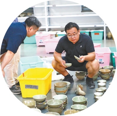 梁國慶(右)在整理出水文物。周瑩水攝