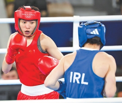 當(dāng)?shù)貢r(shí)間8月6日,中國隊(duì)選手楊文璐(左)在巴黎奧運(yùn)會(huì)女子拳擊60公斤級決賽中。本報(bào)記者 陶相安攝
