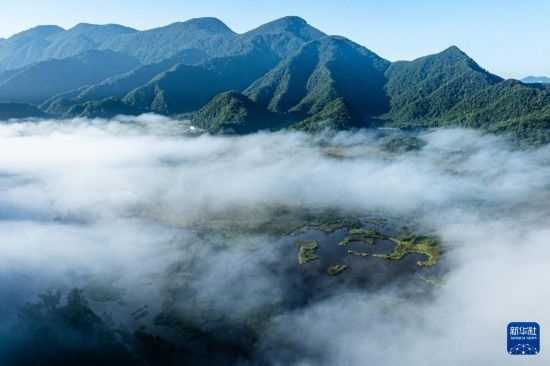 8月16日拍攝的神農(nóng)架大九湖國家濕地公園一景(無人機(jī)照片)。