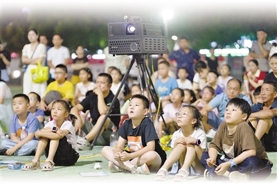 近日,在湖北省襄陽市??悼h體育場,孩子們在觀看電影。楊 韜攝(人民視覺)