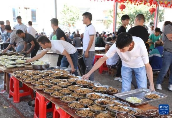 10月5日,在柳州市柳江區(qū)成團(tuán)鎮(zhèn)甘塘村,人們?cè)跍?zhǔn)備重陽節(jié)百家宴。