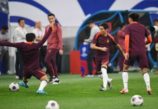 10月14日,中國(guó)隊(duì)球員韋世豪(中)在訓(xùn)練中。當(dāng)日,中國(guó)國(guó)家男子足球隊(duì)在山東青島進(jìn)行賽前訓(xùn)練。新華社記者 李紫恒 攝