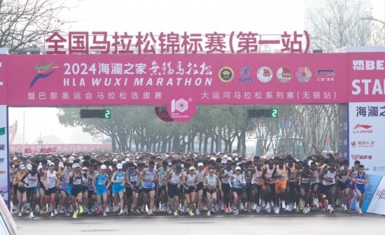 3月24日,參賽選手在比賽中出發(fā)。當(dāng)日,2024無錫馬拉松暨全國馬拉松錦標(biāo)賽(第一站)、巴黎奧運(yùn)會(huì)馬拉松選拔賽、大運(yùn)河馬拉松系列賽(無錫站)在江蘇省無錫市舉行。新華社記者 楊磊 攝