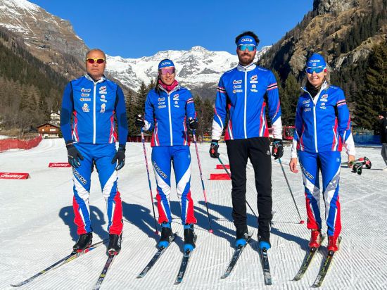 2022年1月24日,泰國(guó)越野滑雪隊(duì)運(yùn)動(dòng)員卡倫·尚?。ㄗ蠖?、馬克·尚?。ㄗ笕┡c父母在歐洲備戰(zhàn)訓(xùn)練時(shí)合影。新華社發(fā)(受訪者供圖)